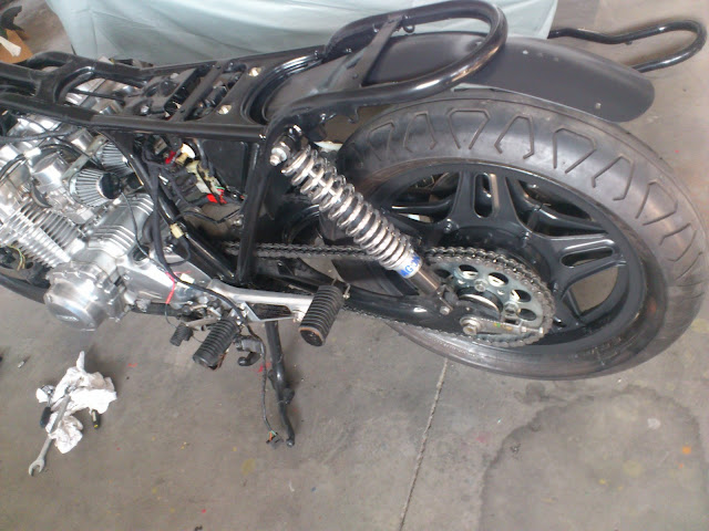 para hacer pruebas de guardabarros trasero le hemos "robado" la rueda trasera a la BMW R80 de Javi y..... la verdad es que blanca y de radios le queda de coña!